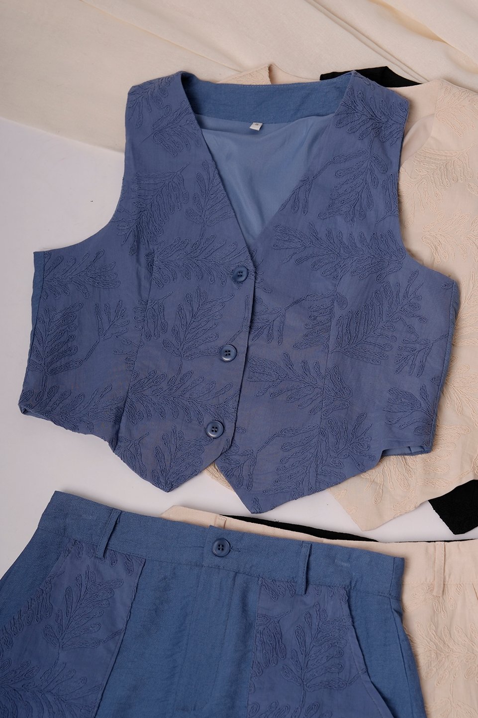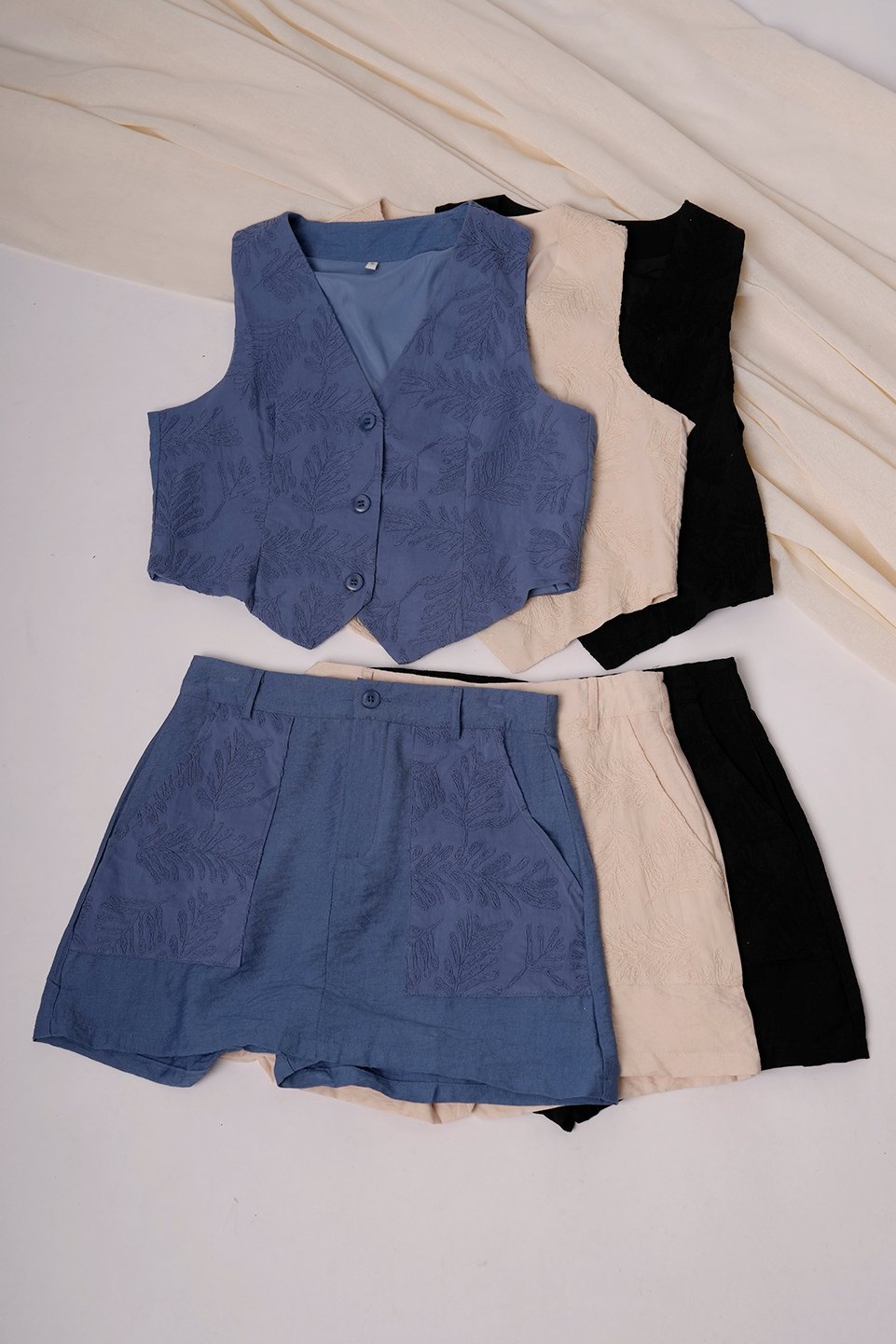 CONJUNTO SASTRERO CHALECO + SHORT POLLERA LINO SASTRERIA BRODERIE