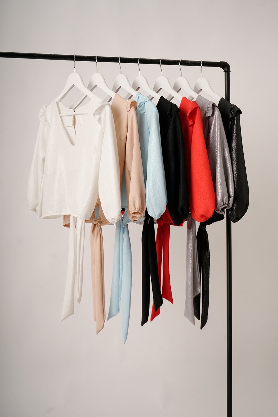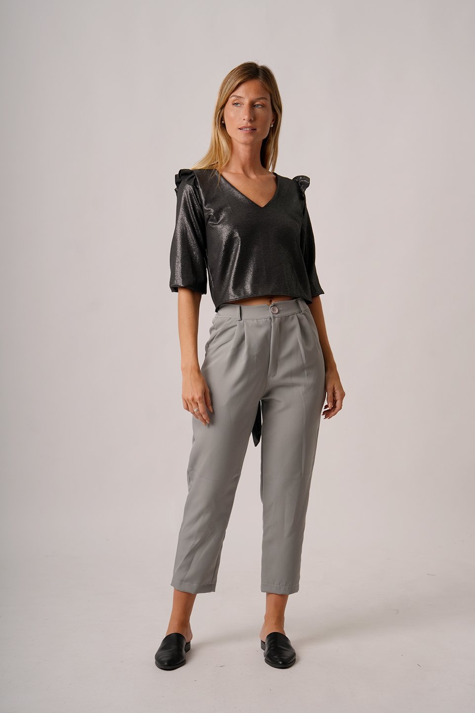 BLUSA CEY FOIL CUELLO V MANGA 3/4 HOMBRO VOLADO BOTON ATRAS Y PARA ATAR